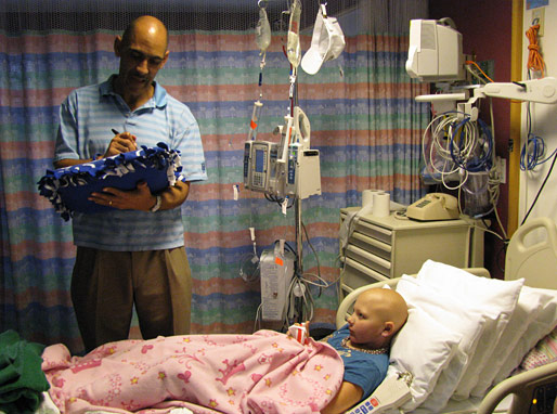 Tony Dungy talking with patient and autographing his pillow