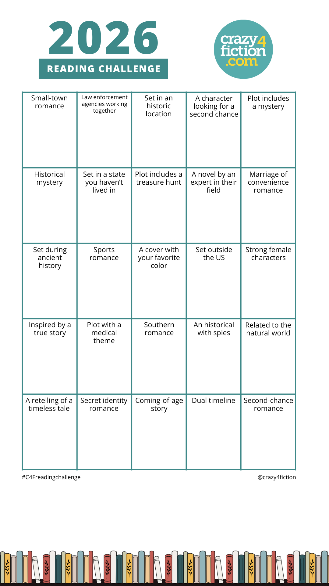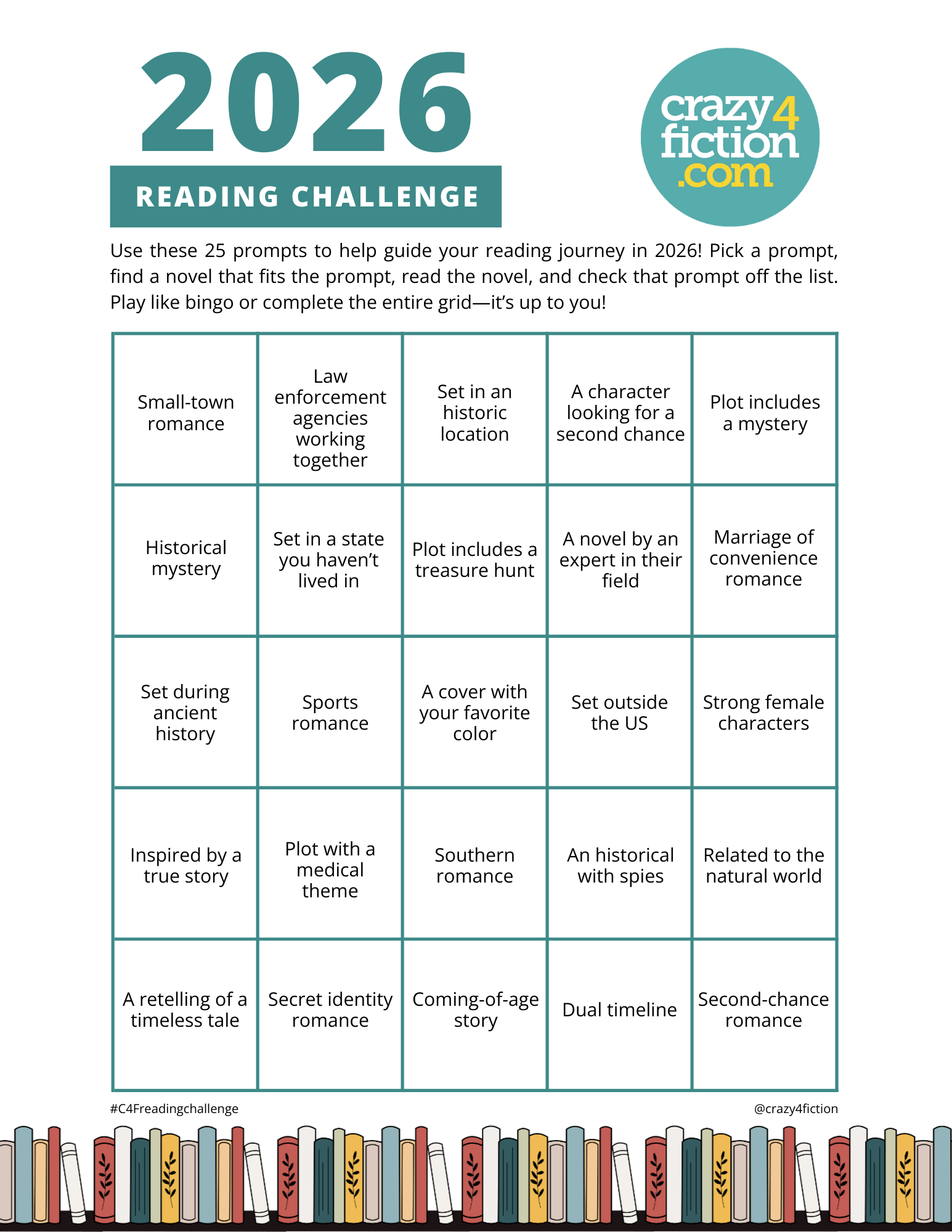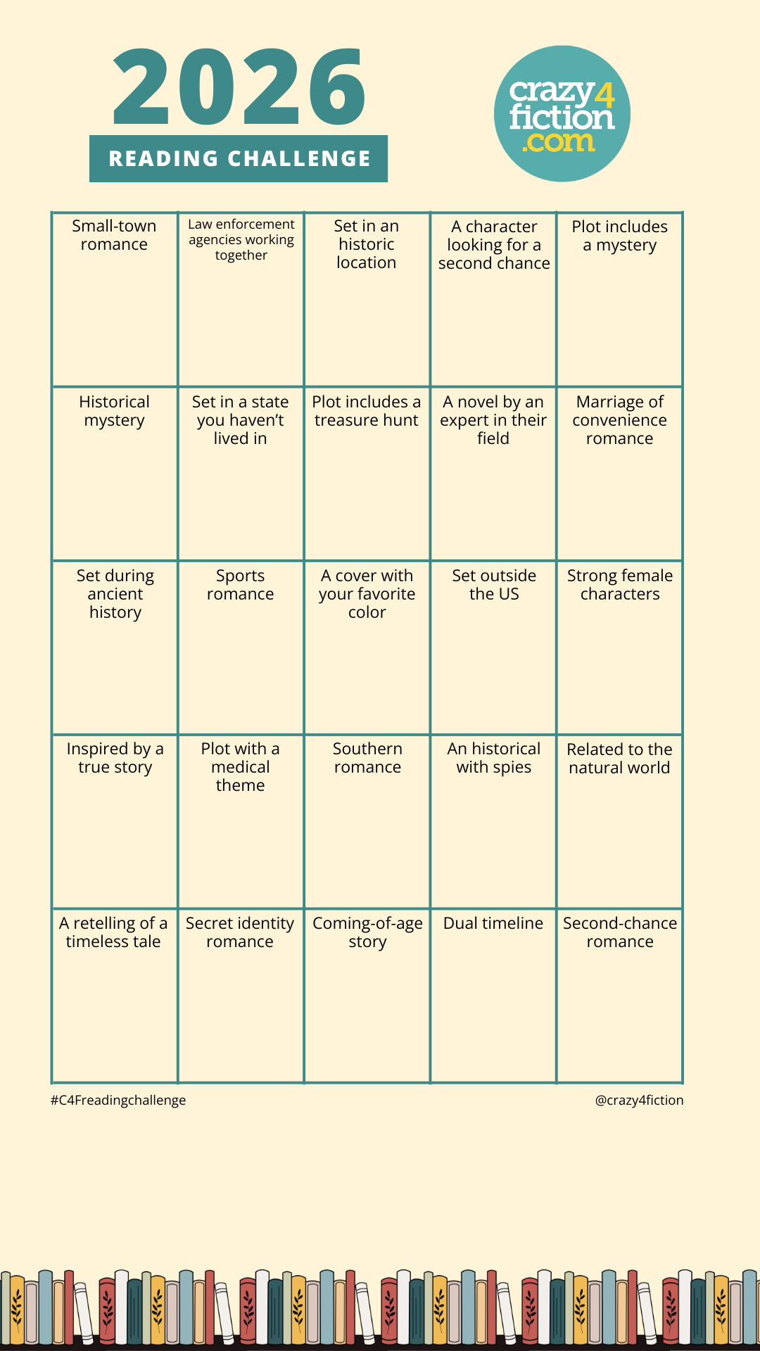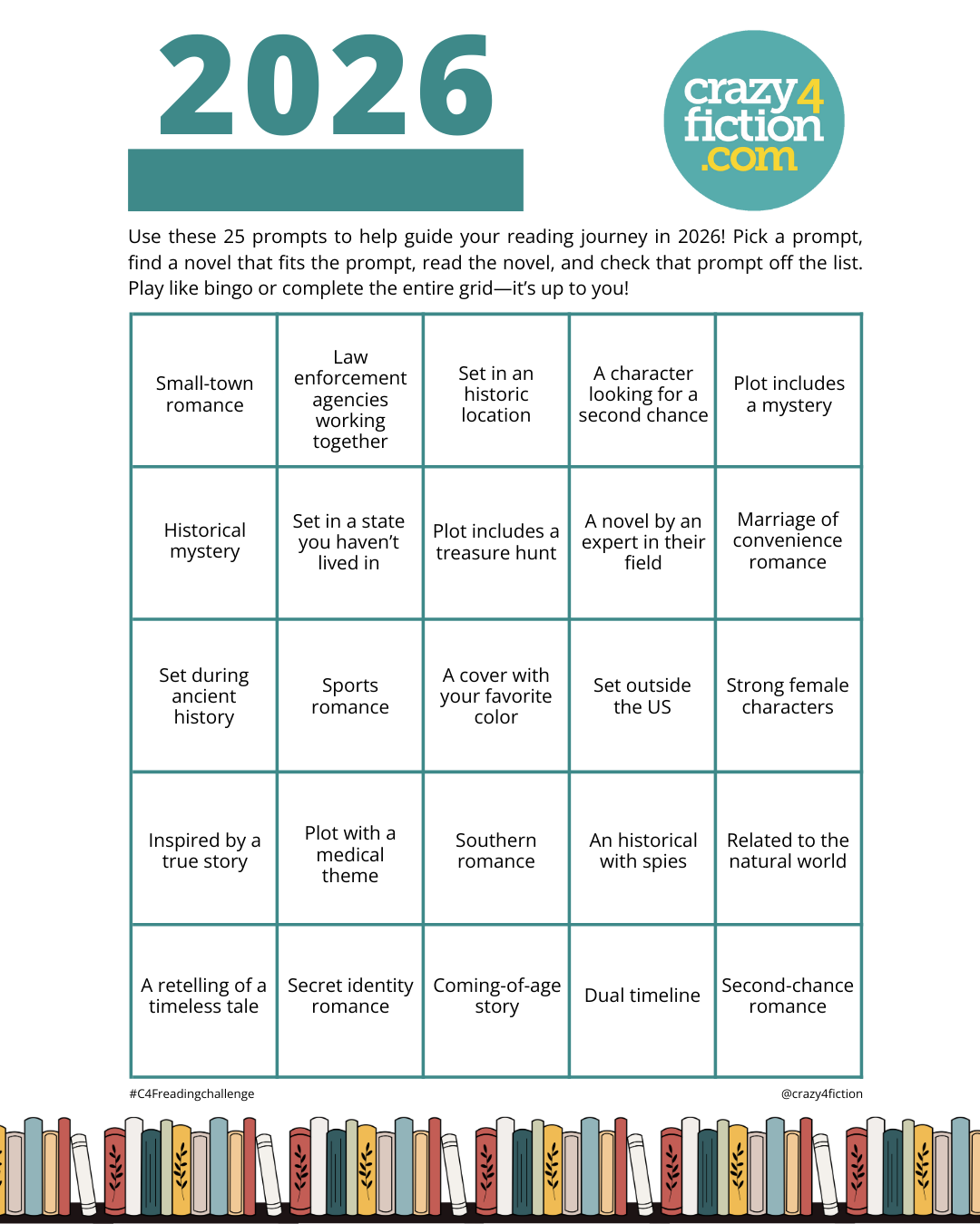 No matter what your reason, Crazy4Fiction has ideas to help guide your 2026 reading journey! Join Crazy4Fiction and readers with the 2026 Reading Challenge.