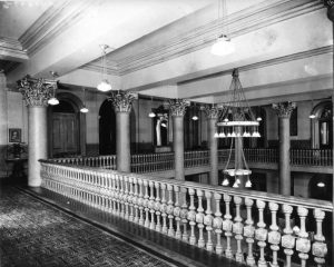 Upon entering, guests found themselves in the grand lobby, with black-and-white marble floors, mahogany woodwork throughout, luxurious furnishings, and resplendent gas-lit chandeliers. The second-floor mezzanine, which looked down upon the ornate lobby, was accessed by a stately, open staircase with carved railings that matched those surrounding the mezzanine.
