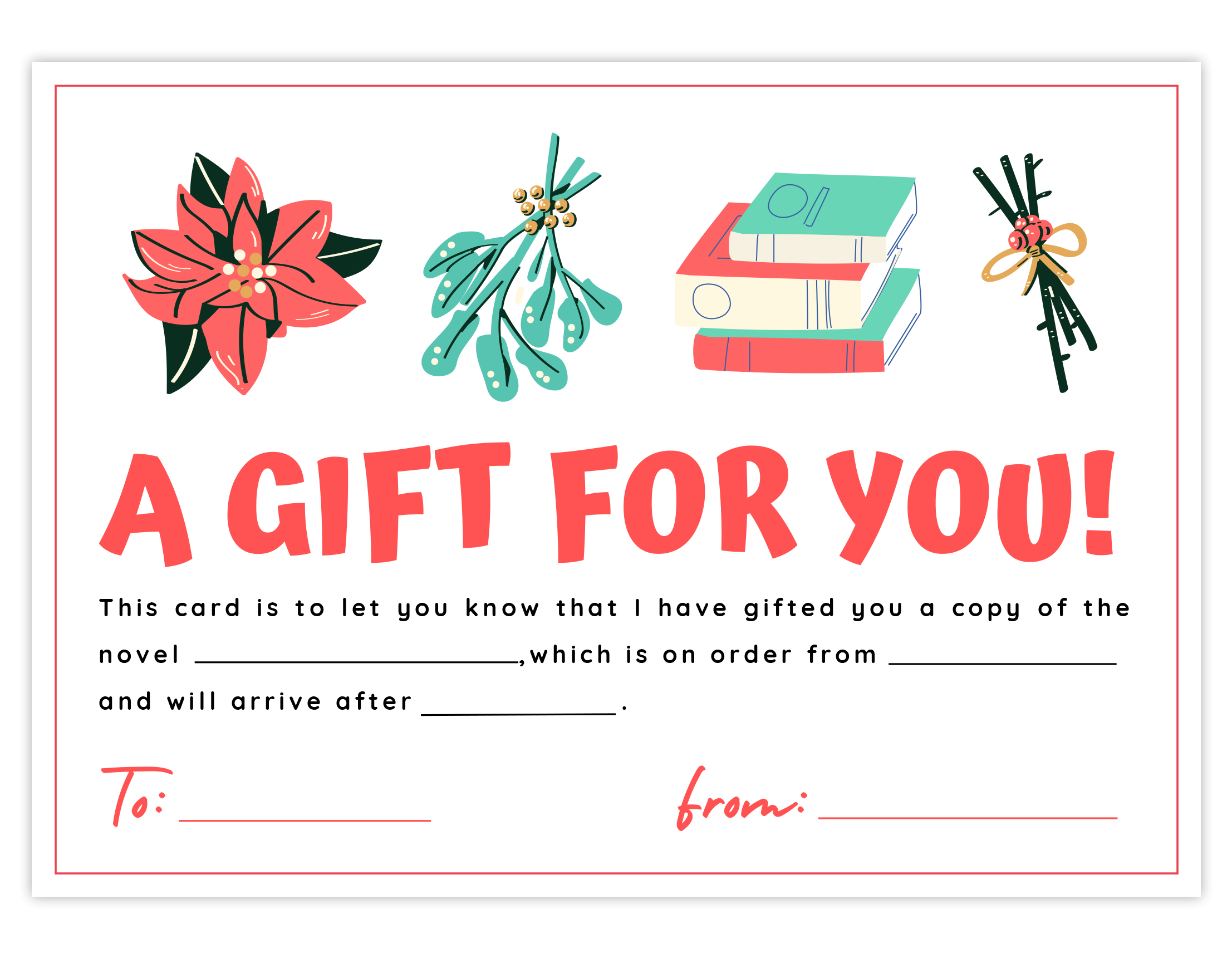 Simply download one of the cards below, print it out, fill in the blanks, and gift to your book-loving friends. It’s a fun way to let those on your gift list know that their gifts are on their way!