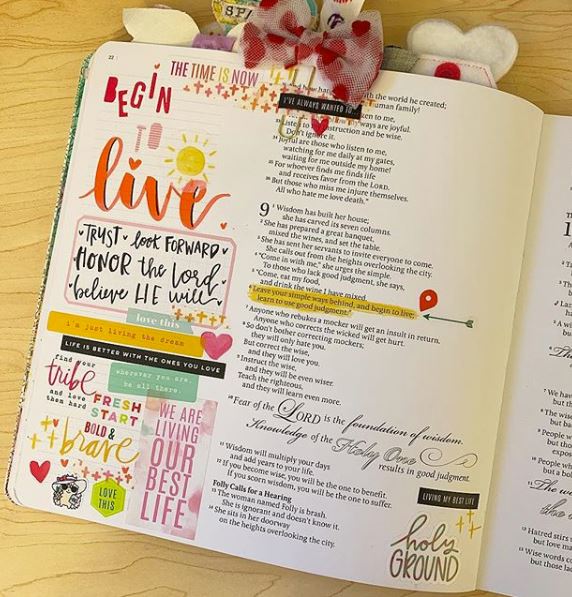 I love how the Reflections Bible has white pages because all the colors and designs just seem to pop off the pages and when you highlight the verses, it seems to show up even more. After I am finished with creating, I will usually write a small prayer, date my entry (I hope to pass my Bibles on to my family someday for them to enjoy, that’s why I date them, plus I like to look back on the entries and see where the Lord has brought me from on those days), and close with prayer. If I decide to share that particular page with social media, I’ll snap a picture sometime after. It’s time well spent, I’ve learned a new verse or revisited an old one. I’ve been able to use my creative skills and I’ve had alone time with my Savior all rolled up into one. My heart couldn’t be fuller!