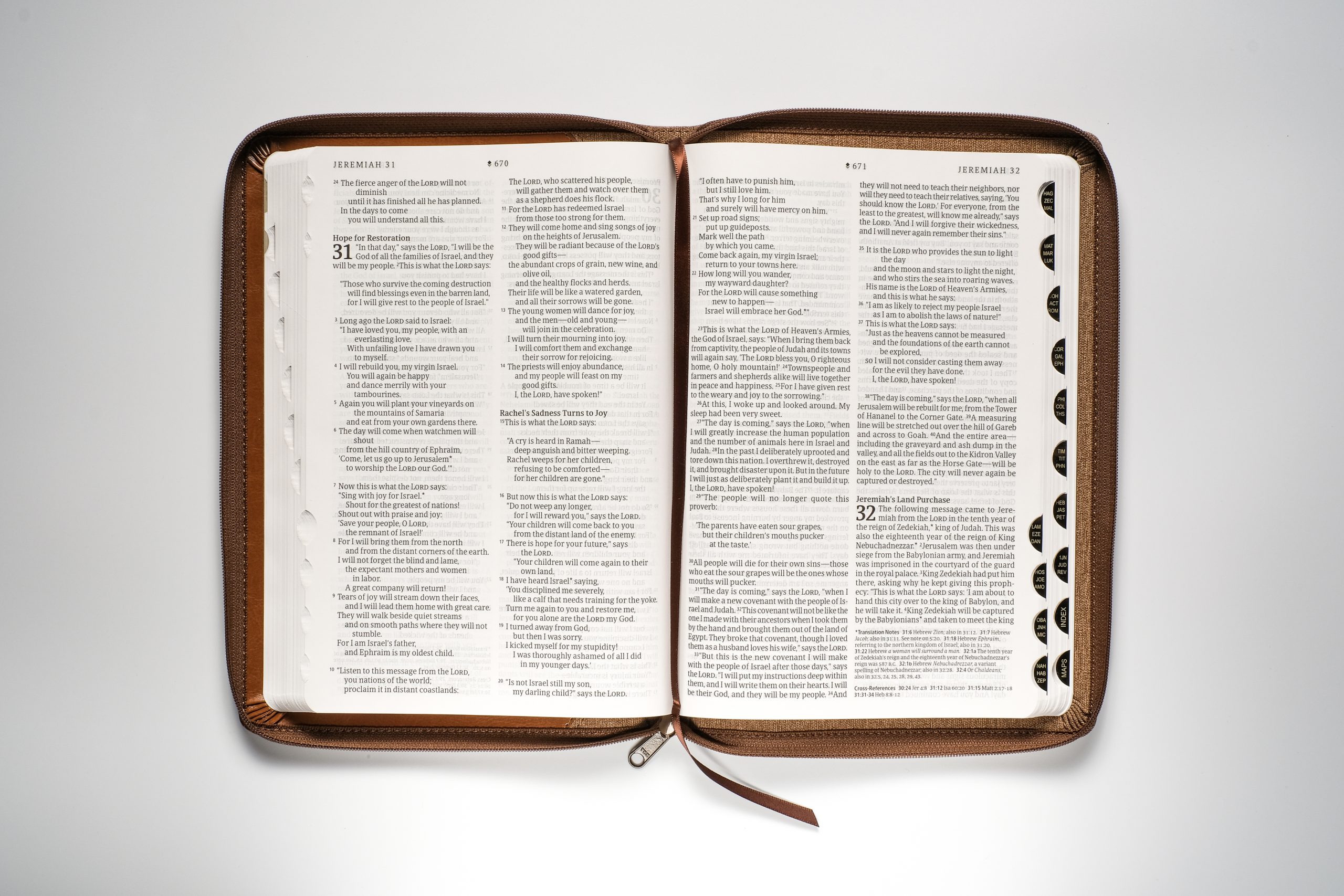 Jim: When you look at several Tyndale Bibles, you’ll note a lot of common elements: the written text of God’s Word (we feature the clear and accurate New Living Translation), beautiful and durable covers, a table of contents, Bible index, and other common features. But what I want for Christmas this year is an edition of the NLT Large Print Thinline Reference Bible that is equipped with the Filament Bible app and, yes, a zipper. When I previewed this Bible, I was struck by its unique qualities. It is a remarkably thin Bible—I thought at first that it was a New Testament, but it’s the whole Bible! The Large Print edition is super readable, but the type is not oversized; it’s “just right” for my eyes. I like the Messenger Stone and Camel cover—a TuTone brown cover. Although it’s LeatherLike, part of it looks and feels like cloth. Here’s why I love the zipper feature: I’ll keep this Bible in my backpack, which can be hard on books and Bibles, but having it zippered will protect the pages. Translation notes and cross-references in the lower right corner of each two-page spread help make this a nice reading Bible with just the right amount of references. There are two additional features in the back of the Bible: the “Tyndale Verse Finder,” which is organized by theme, and the fabulous “Visual Overview of the Bible,” with full-color maps and charts.