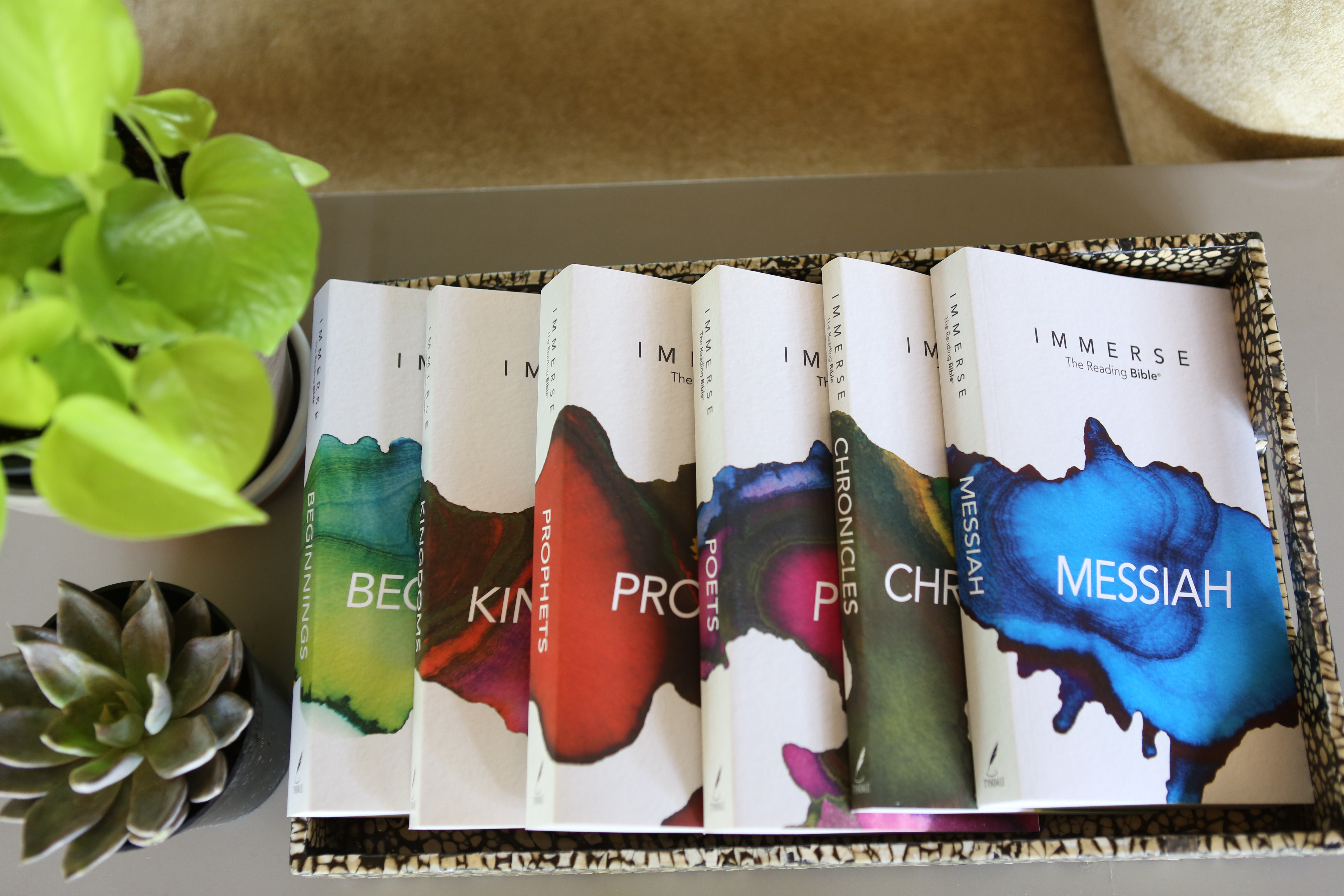 Immerse: The Reading Bible is the Bible divided into six volumes. It removes chapter and verse numbers for a more seamless reading experience. These paperback volumes help you easily read full passages instead of tiny verse nuggets. Clearing away distractions lets you immerse yourself in the story.