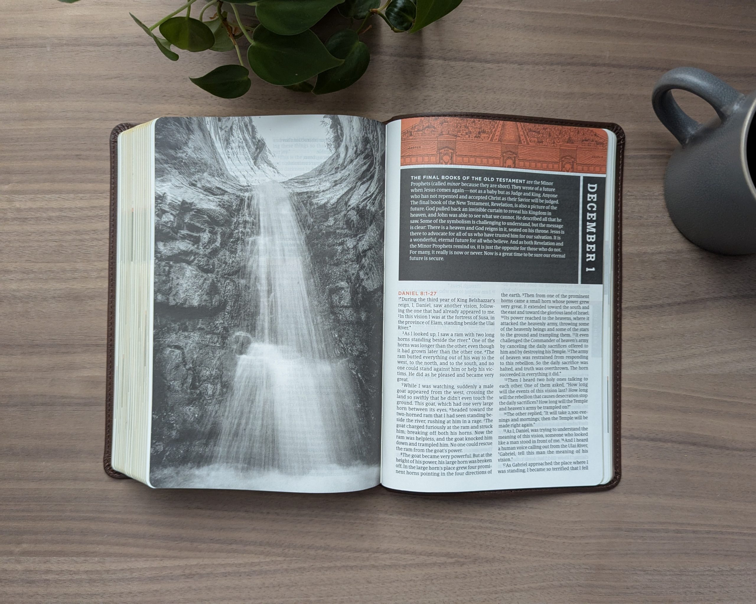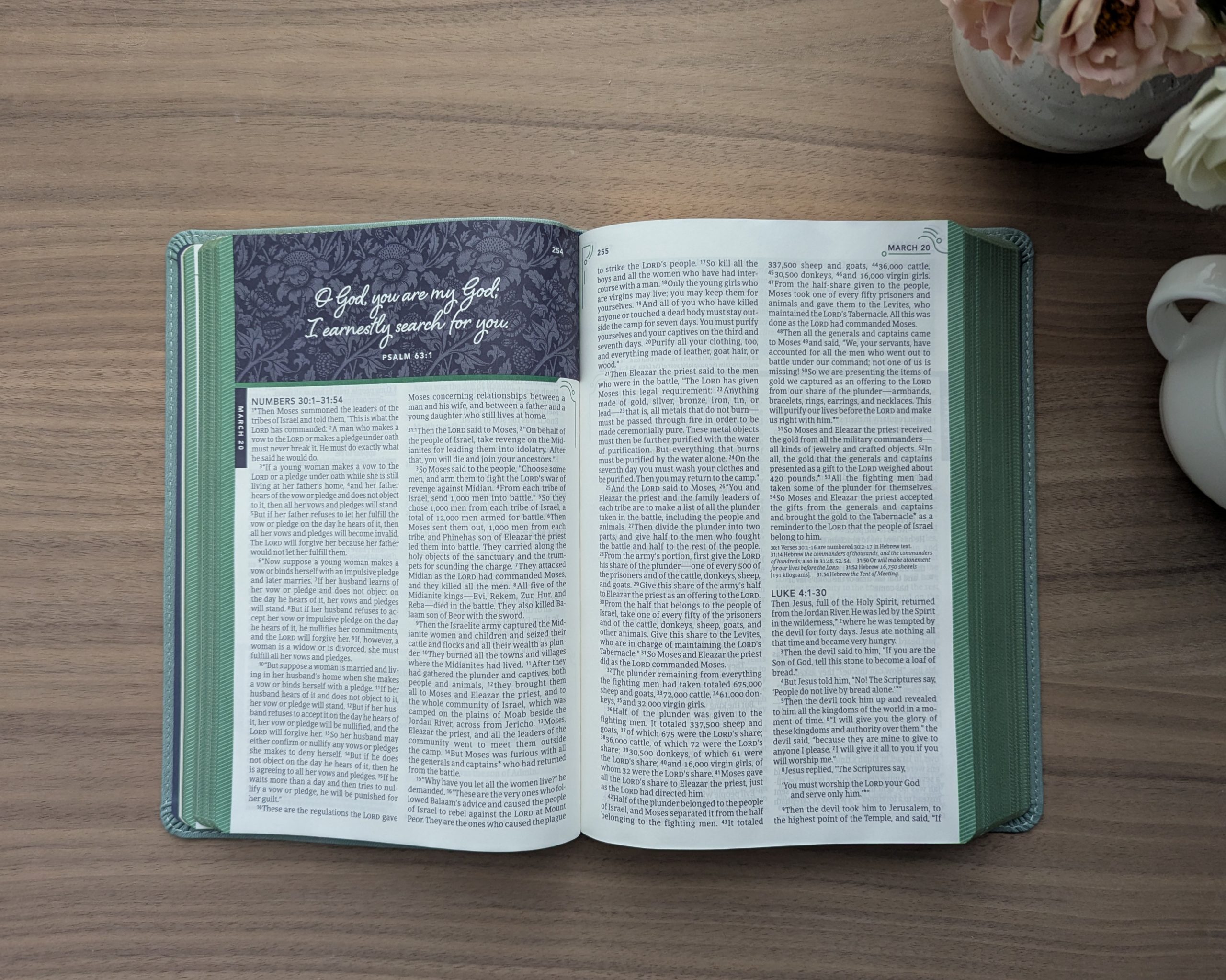 The One Year Bible for Men and The One Year Bible for Women are getting an upgrade this season and will be available in LeatherLike editions. The men’s edition has a smooth rustic brown cover with an image of a mountain on the front. The women’s edition is a gorgeous teal with images of birds and leaves on the front and Scripture embossed on the back.