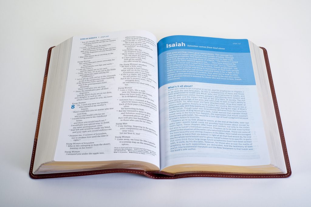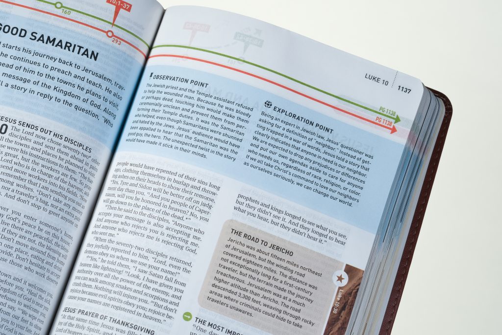 The Illustrated Study Bible brings Scripture’s message to life by giving readers a gorgeous visual study experience. Hundreds of information-rich windows to the Bible world instantly communicate foundational truths and complex information in an understandable, compelling way for today’s visual generation. The who, what, where, when, and why of the Bible come alive with stunning photos, illustrations, infographics, and full-color maps integrated seamlessly with background material, study notes, and theme articles. Purchase here