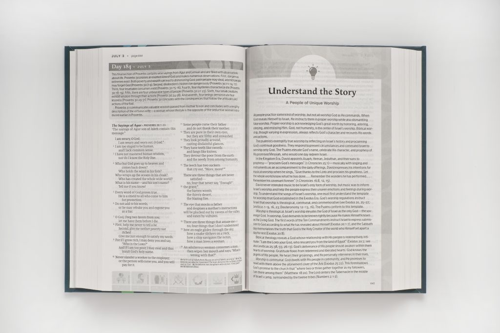 The One Year Chronological Study Bible is a truly unique combination of tools to transform your Bible reading and study. We call it The Five-Tool Bible because it employs five “tools” for a fresh reading experience. This Bible tells you the most important story of all time—the grand story of the Bible—like you’d expect it to be told: from beginning to end.