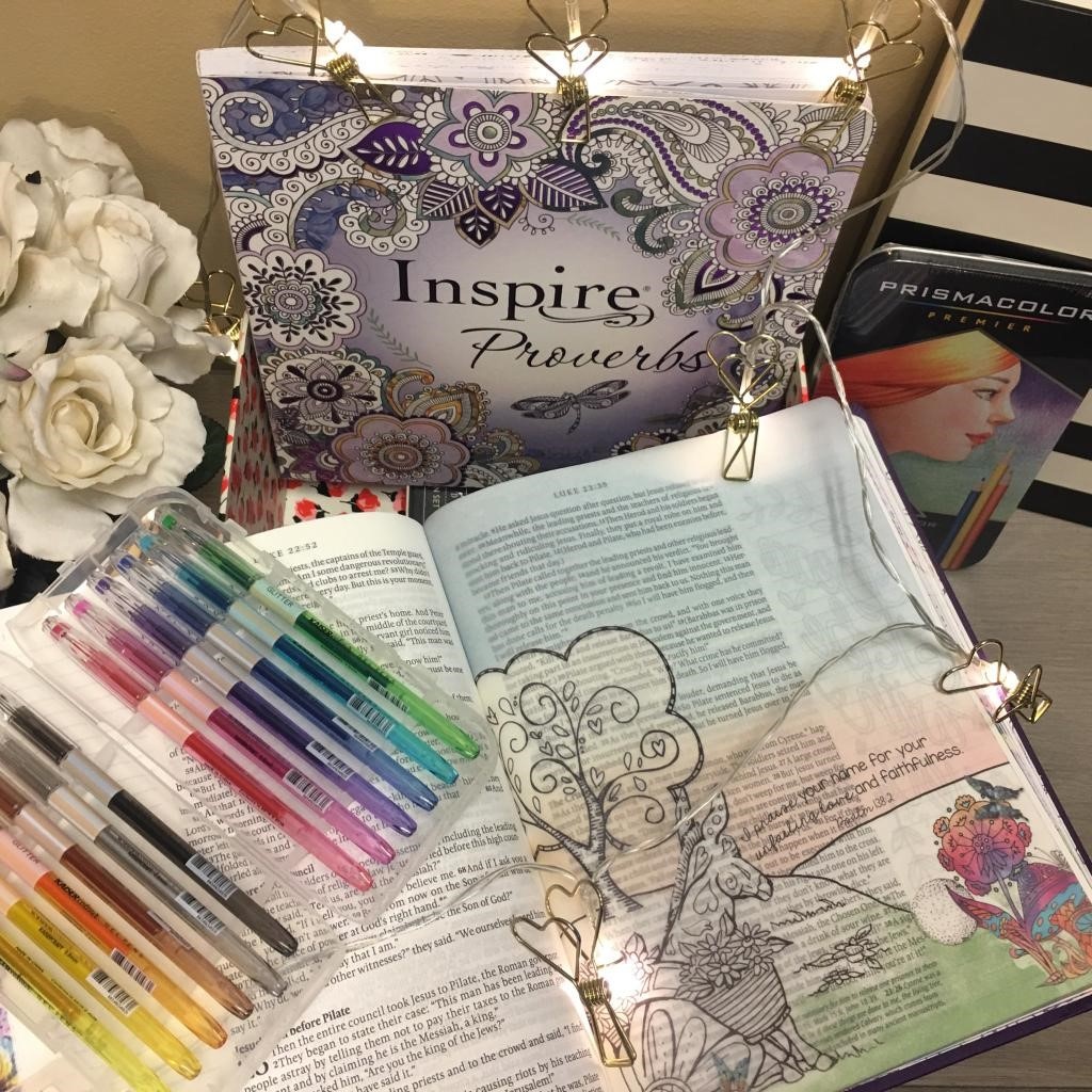 When I sit down and open my Inspire Bible, I focus on 4 things (pray, read, ask, respond). I open with prayer. I invite the Holy Spirit to challenge, encourage, and sharpen my faith. I then read a portion of Scripture. This seems obvious, but I admit, there are times I just want to color and not read the words. But because this is more than a coloring book, I keep the Word central. As I’m reading, I’m asking three questions: What stands out? What does this passage tell me about God? What does this passage tell me about how to live? THEN, I respond in the margin. I use the margin to answer one of those three questions. I keep it as simple as possible because I want to be able to read, respond in the margin, close my Bible and live out what I’ve learned! I want to be able to remember what I read and processed. It’s a life manual that invites you to respond with creativity in the margin.